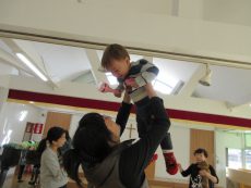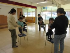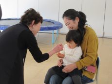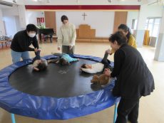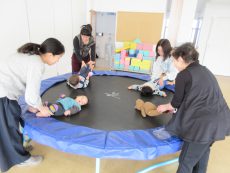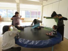 ふれあいながら、リズムにのりながら、トランポリンの上に乗りながら、おうちの方と一緒に
